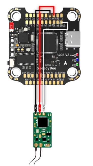 Vamos a ver, la conexión del receptor y la controladora debe de ir entre "S" del receptor y SBus del pin de la controladora, además tienes que configurar con Betaflight el protocolo o señal que emite el receptor, en este caso es SBus, entras en Betaflight en Receptor mode - > Rx_Serial - >Serial Receiver Provider = SBUS y grabas al salir.